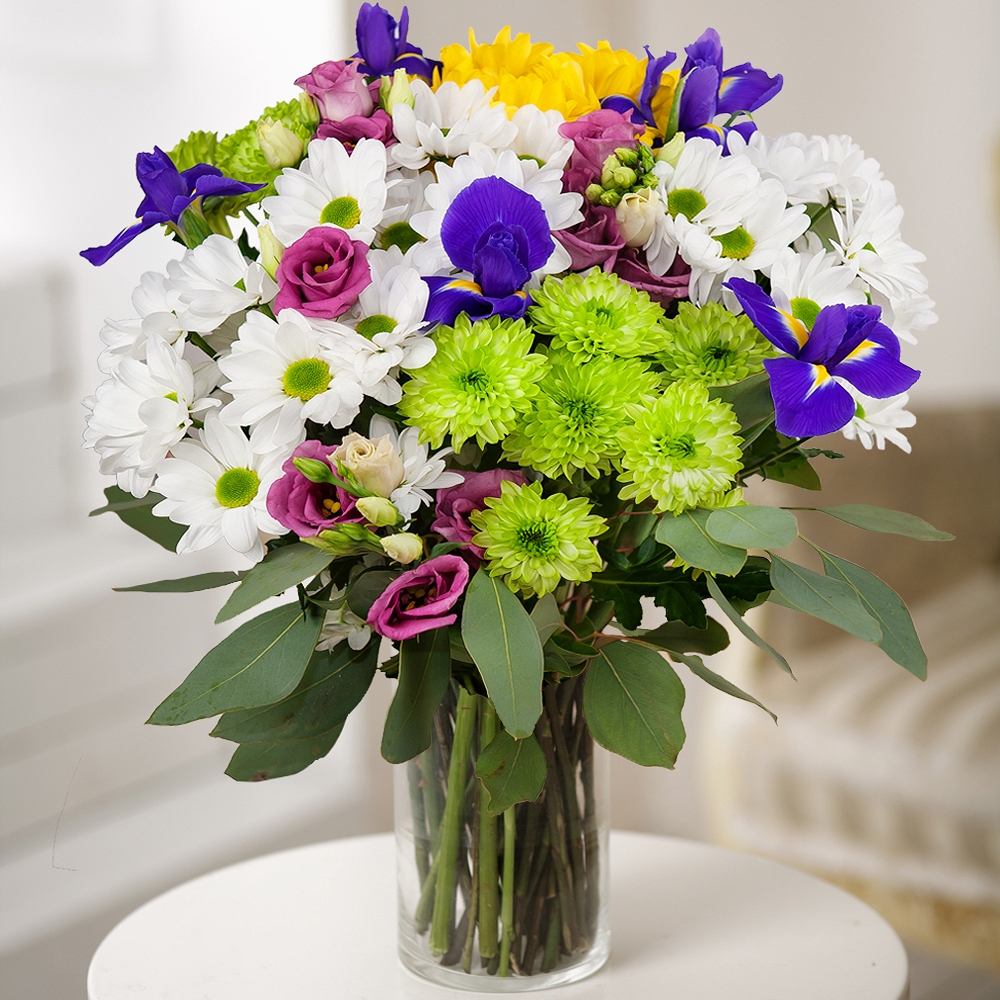 Букет «Радостный миг» — это яркий и стильный подарок, который подарит получателю незабываемые эмоции и впечатления. Букет собран из лизиантусов, ирисов, кустовых хризантем и эвкалипта. Эти цветы г...
