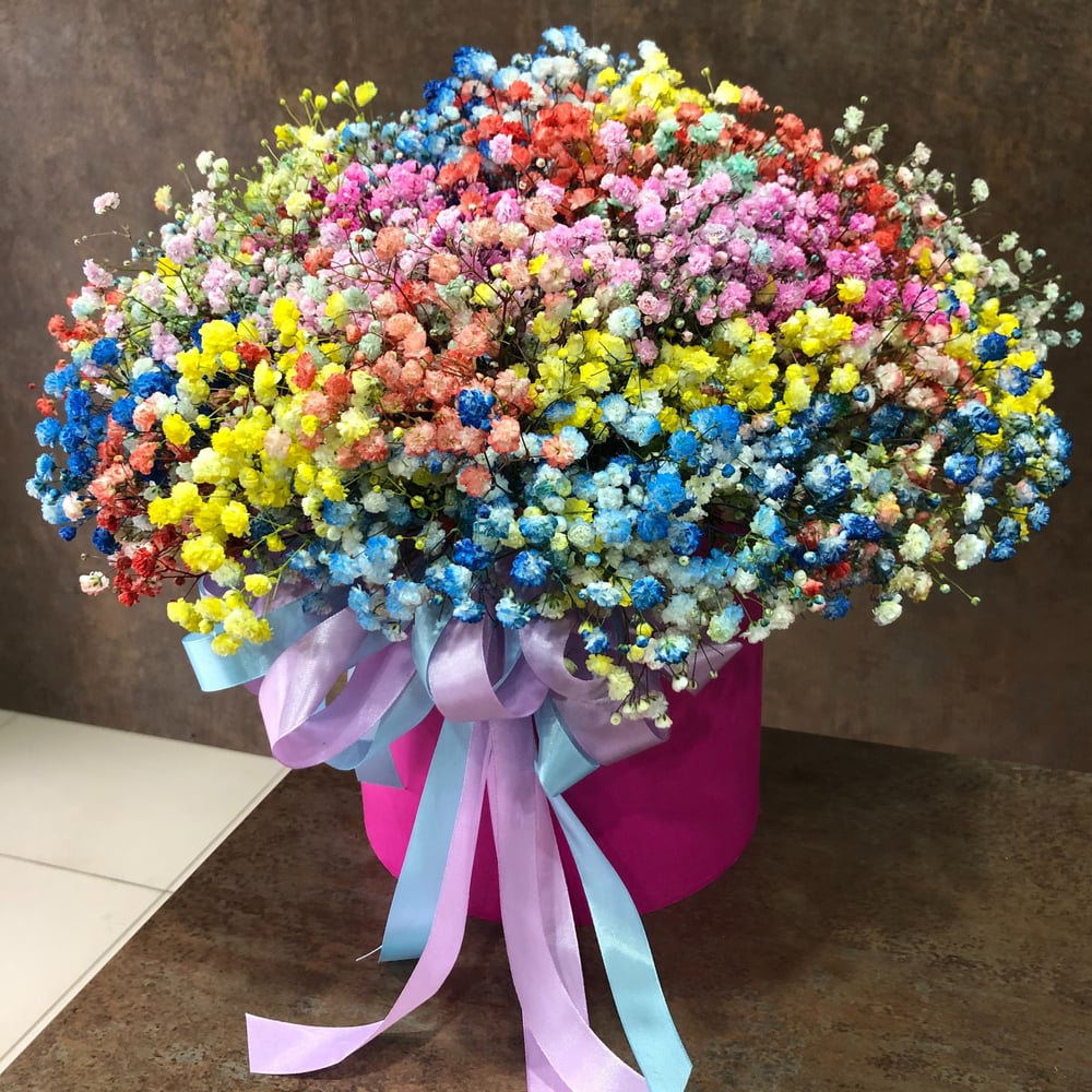 Шляпная коробка с цветами «Радуга» из гипсофил
