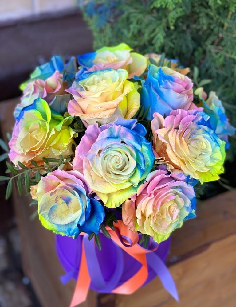Что такое радужная роза? Радужной называются специально окрашенные розы с разноцветными лепестками: зелеными, синими, желтыми, красными, розовыми, фиолетовыми. Благодаря особой технике окрашивания бутонам можно придать любой цвет и даже абсолютно неестественный: черный, салатовый, голубой, неоновый.