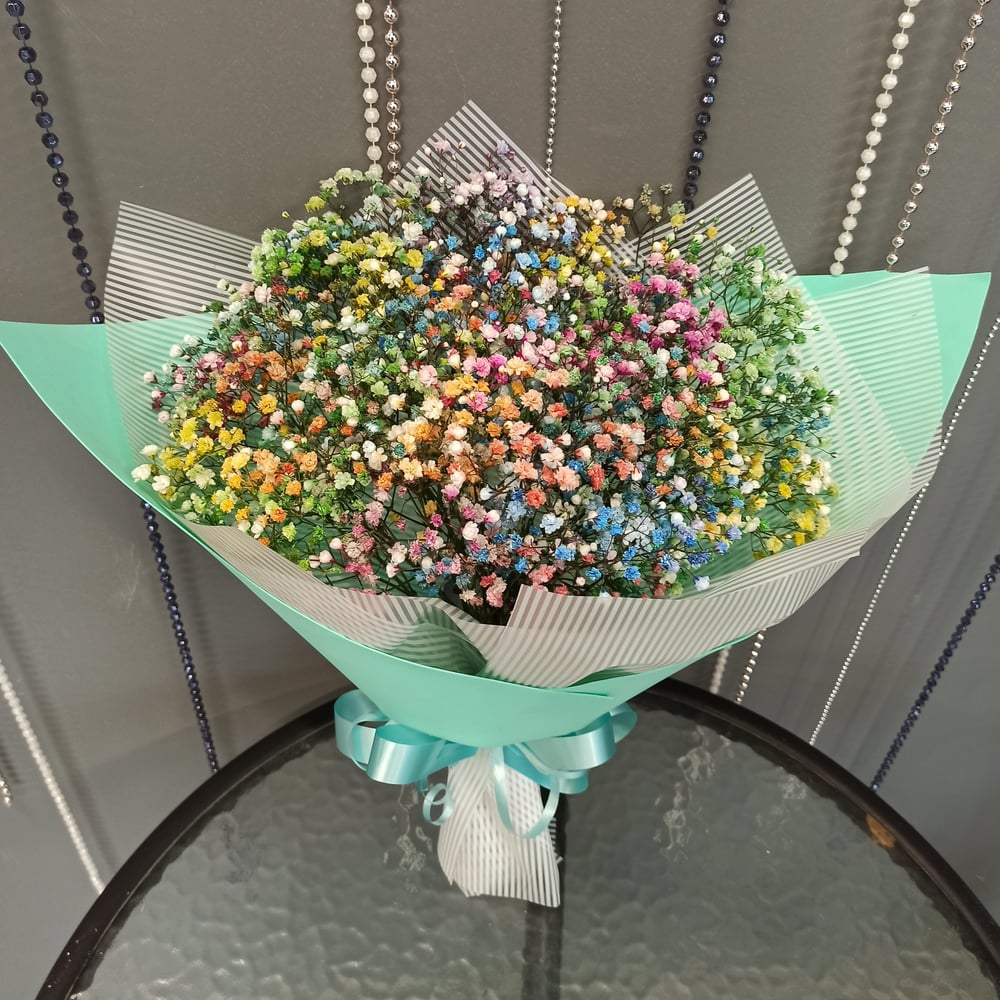 Яркий, объемный букет из радужной гипсофилы, будет радовать вас несколько месяцев сначала, как живой цветок, затем как сухоцвет.