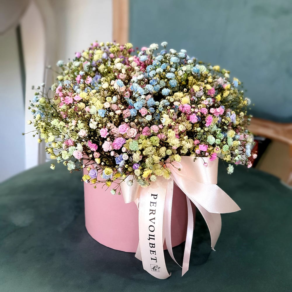 Шляпная коробка с цветами «Радуга» из гипсофил