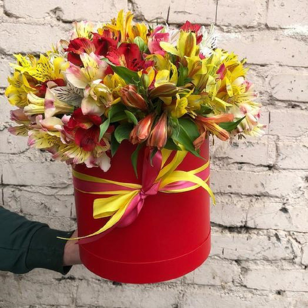 Букет из альстромерии микс. Яркий и сочный как лето ! Букет упакован в шляпную коробку и перевозится получателю в аквапаке, что позволяет цветам при транспортировке сохранять свою свежесть.. Такой букет будет прекрасным подарком на любое торжество.