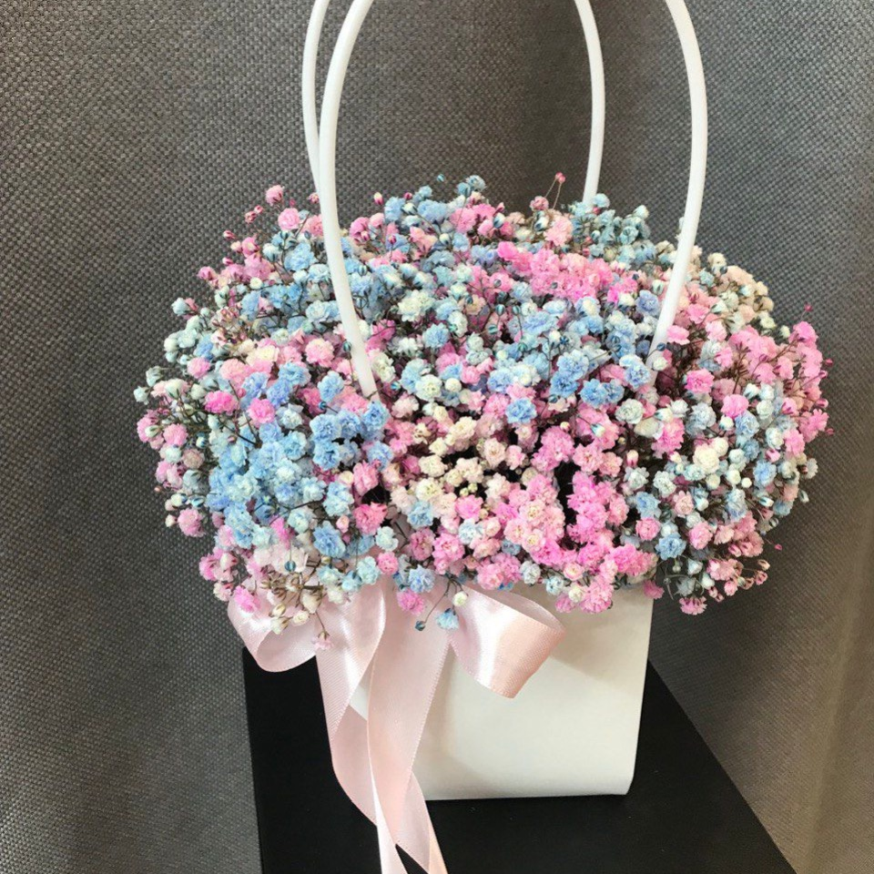 Коробка с цветами «Радужная гипсофила в белой сумочке»