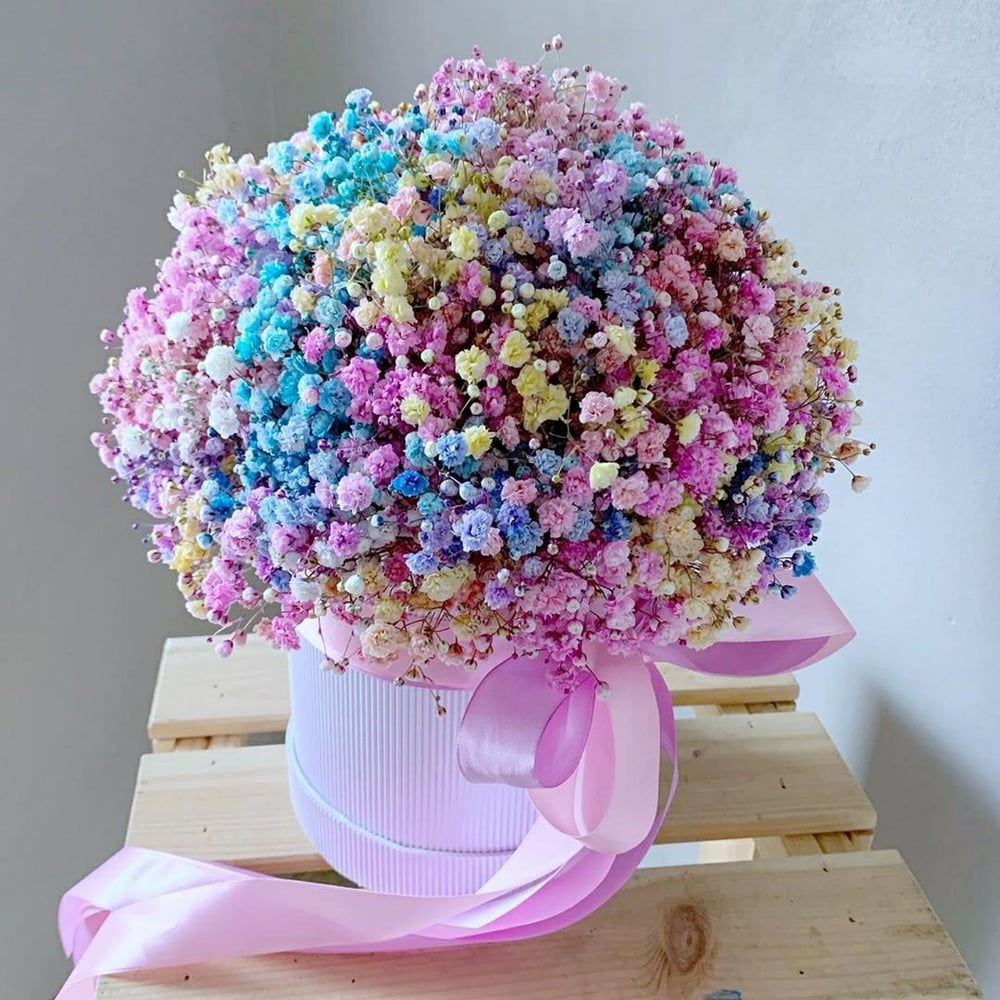Шляпная коробка с цветами «Радужная гипсофила в коробке S»