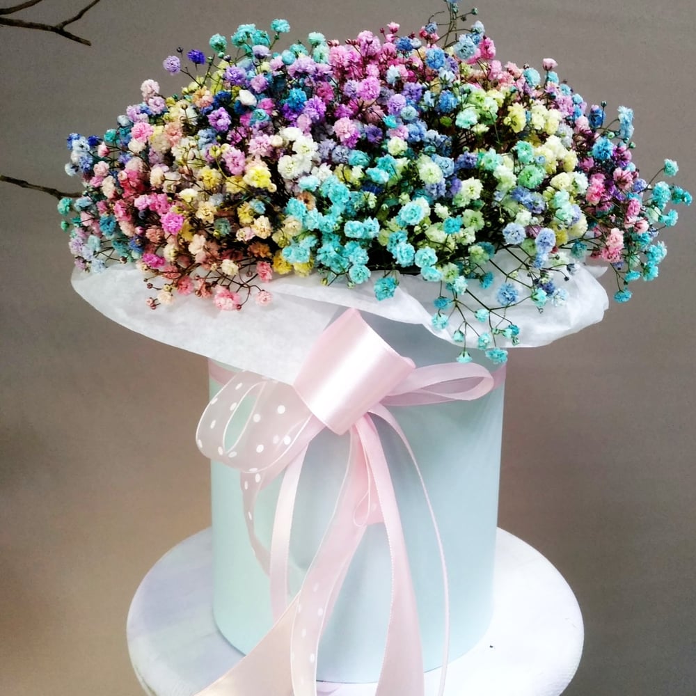Шляпная коробка с цветами «Радужное лето» из гипсофил