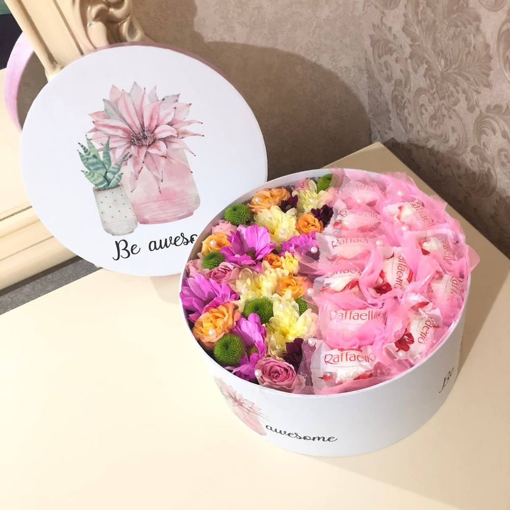 Подарочный набор «Рафаэлло и цветы в коробке» из хризантем