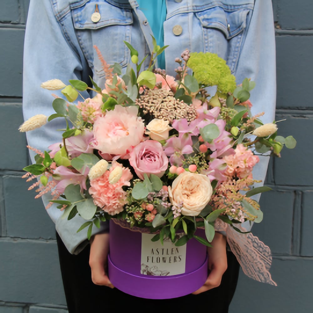 Нежная композиция в шляпной коробке подойдет для подарка на любой случай