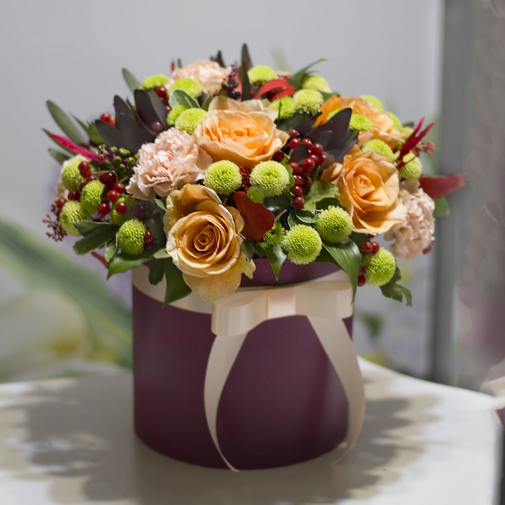 Композиция коробке для ценителей глубоких цветов и осенних оттенков. Может быть подарена как женщине, так и мужчине и стать самостоятельным подарком или же дополнением к нему.