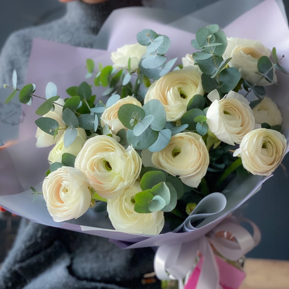 Стойкий букет кремовых лютиков с ветками эвкалипта в стильной упаковке.