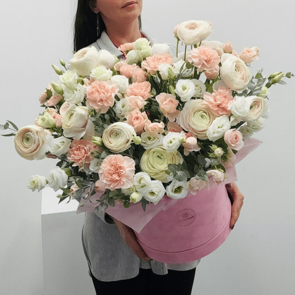 Подарите ощущение роскоши и исключительности с нашей премиум-композицией. В элегантной розовой шляпной коробке собраны элегантные ранункулюсы, нежные розы и изысканные диантусы. Каждый элемент тщательно подобран, чтобы создать богатый и насыщенный образ. Это не просто цветы, это произведение флористического искусства, призванное произвести неизгладимое впечатление на самого взыскательного получателя. Идеально для знаковых событий и важных дат.