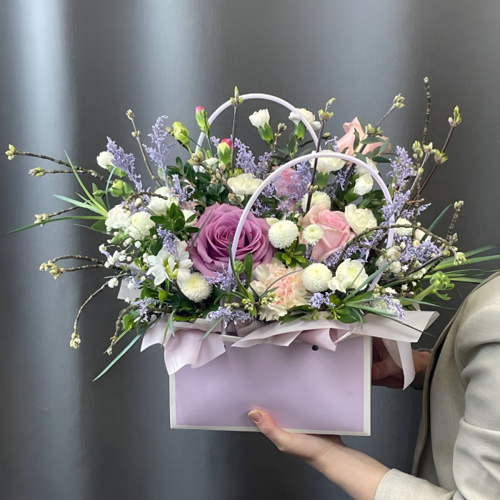 Игривая и нежная композиция в цветочной сумочке состоит из роз, кустового диантуса, хризантем и невероятного флористического декора, который не перестает удивлять нас своей природной экзотикой. Рол...