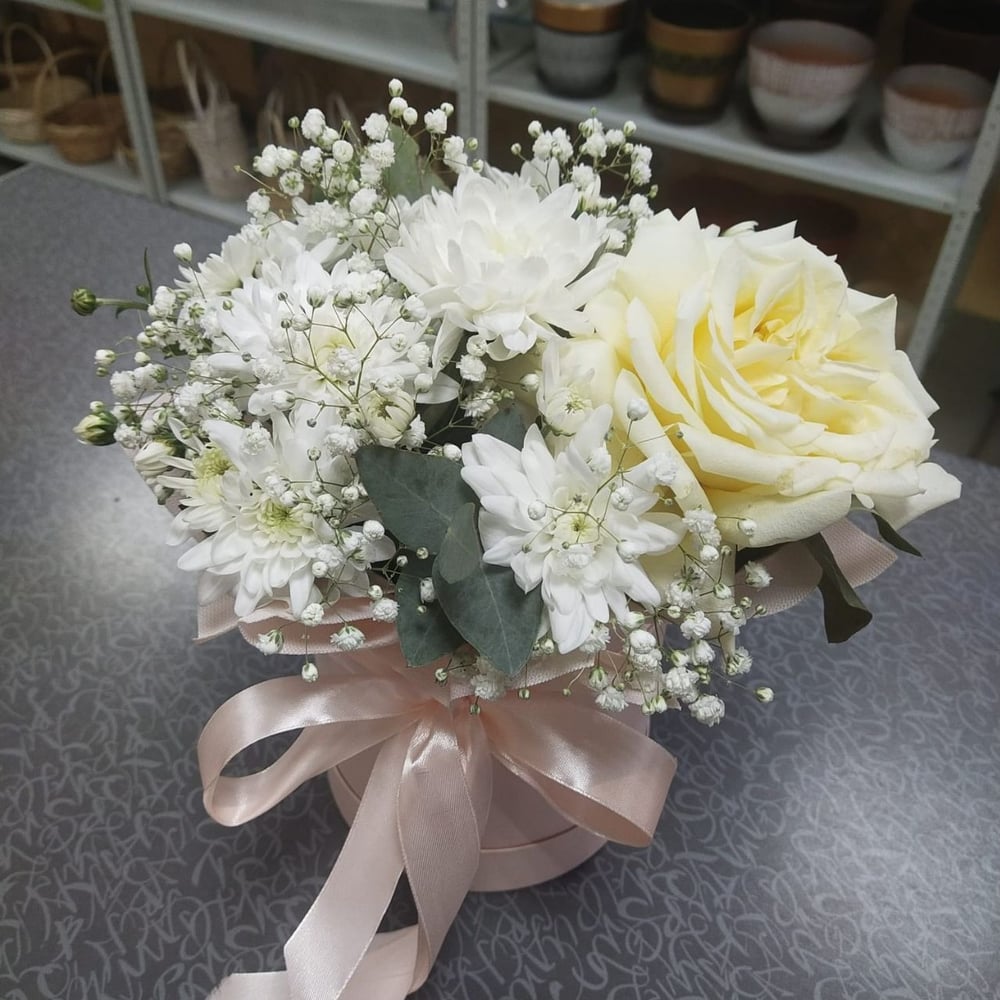Шляпная коробка с цветами «Райский сад» из роз и хризантем
