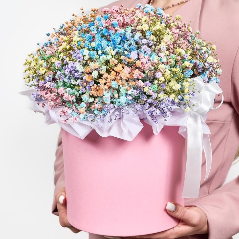 Шляпная коробка с цветами «Разноцветные гипсофилы в коробке, 11 шт»