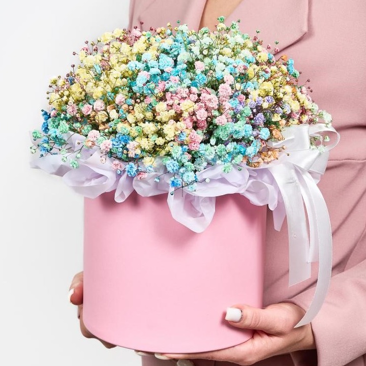 Шляпная коробка с цветами «Разноцветные гипсофилы в коробке, 9 шт»