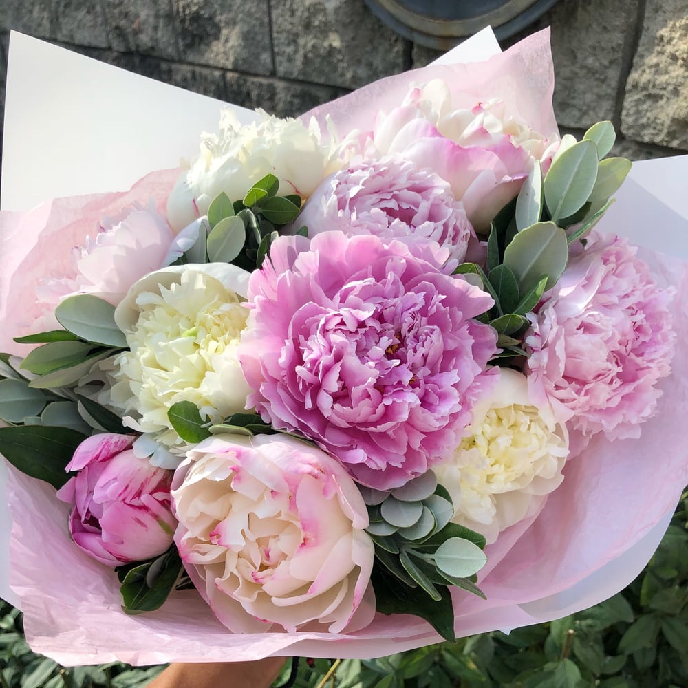 Букет из разноцветных пионов с ярким, удивительным ароматов.