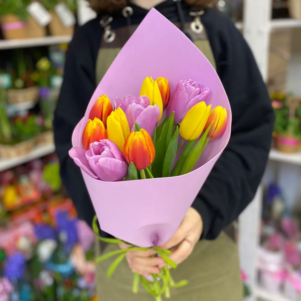 Микс тюльпанов в декоративной упаковке для поздравлений с весенним настроением