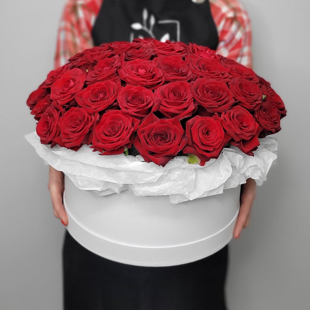 Букет в шляпной коробке из крупных роз красного оттенка с бархатистыми лепестками, всегда был ассоциирован с любовью и страстью