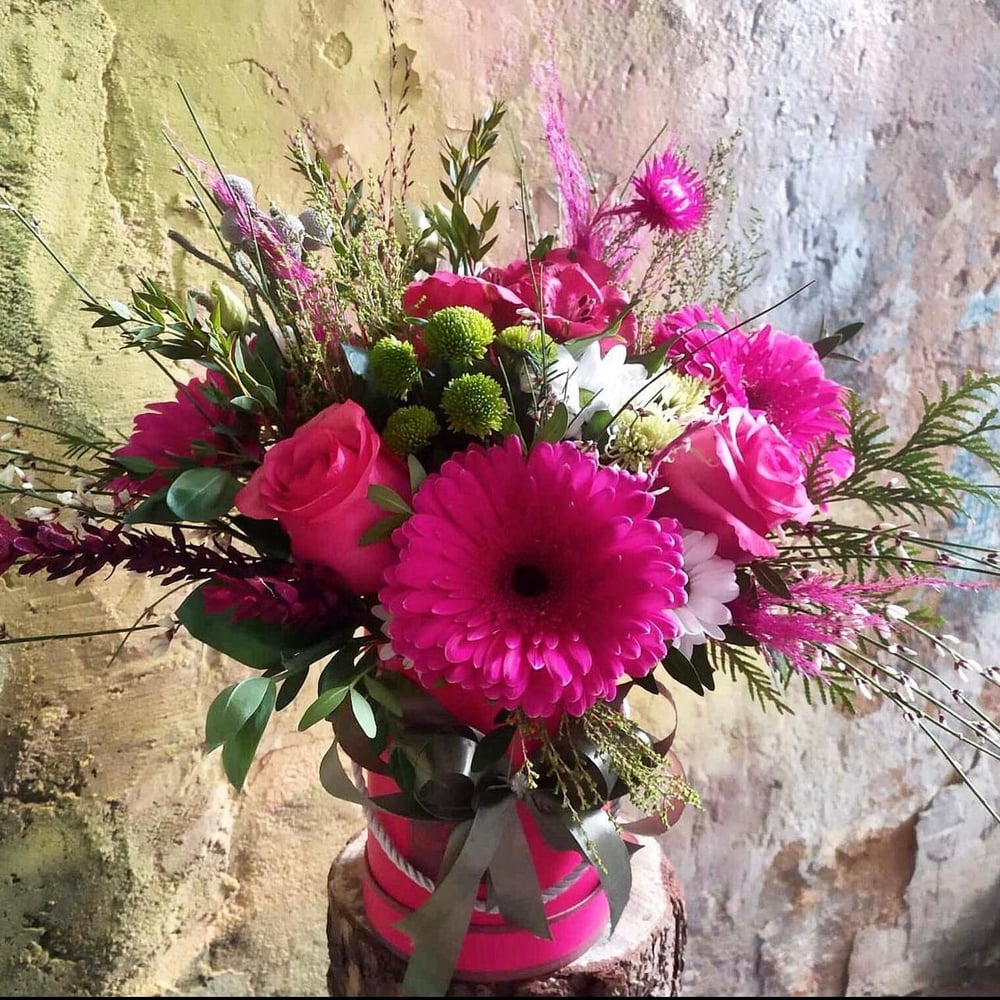 Шляпная коробка с цветами «Реверанс» из гербер и хризантем