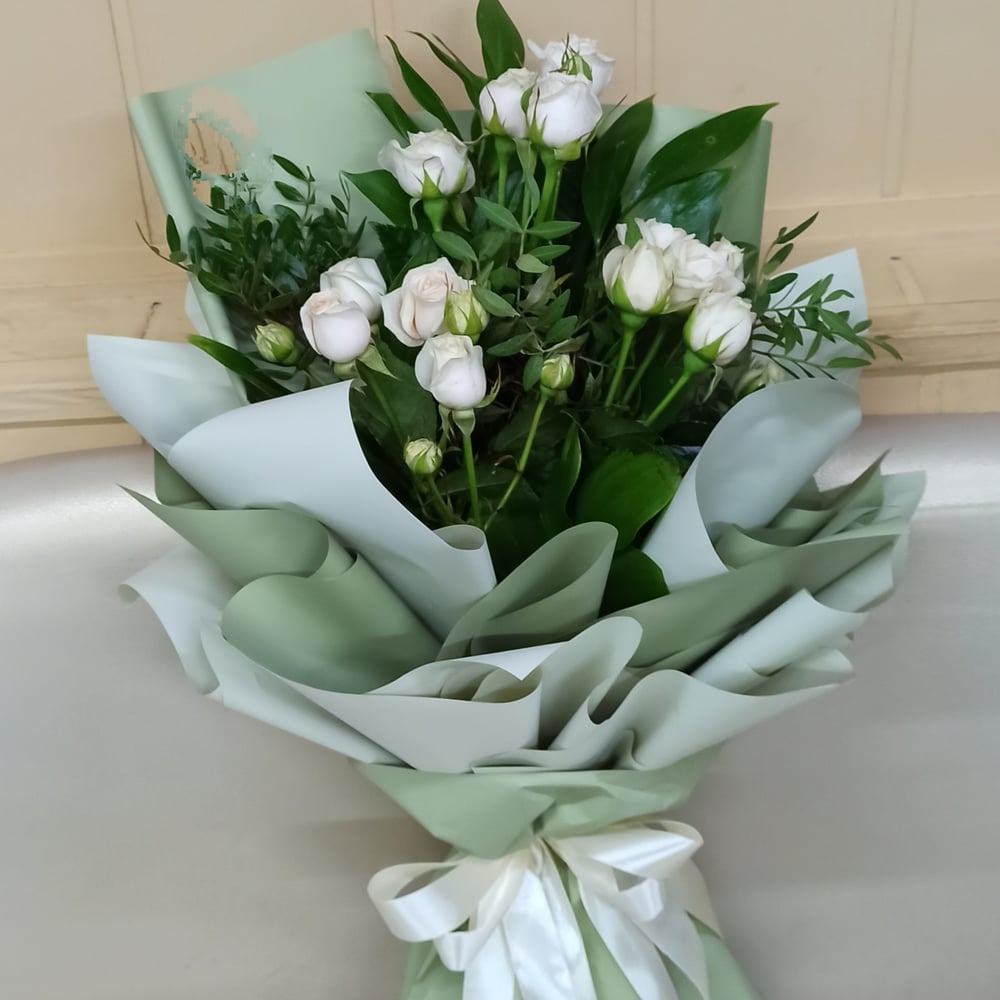 Букет-комплимент из кустовых роз и нескольких сортов декоративной зелени. Современная многослойная упаковка. Цвет кустовых роз и упаковки можно оговаривать с флористом.