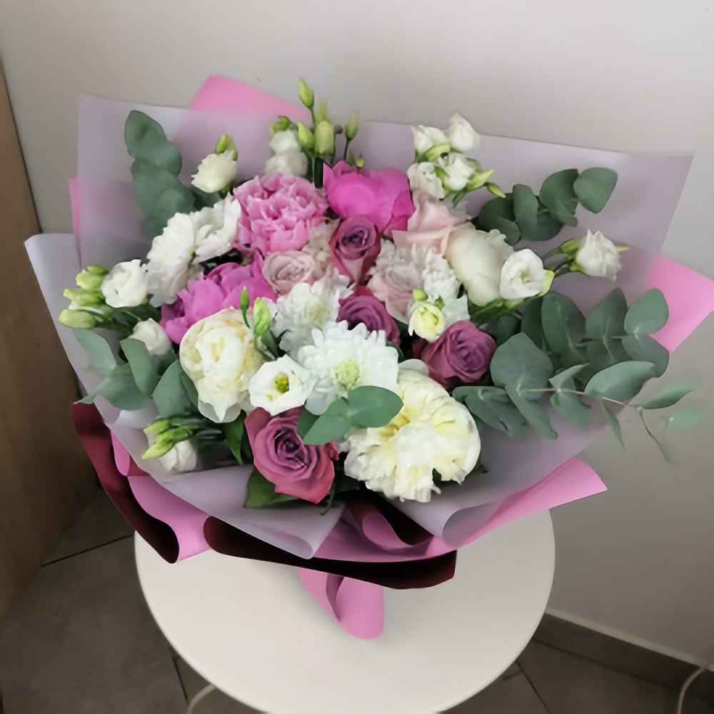 Как рассказать о нежности и любви, восхищении и благодарности, о самых тёплых чувствах на языке цветов? Этот прекрасный букет, сотканный из ароматных пионов, разноцветного кружева роз и белоснежных эустом донесёт эти чувства лучше любых слов. Пусть это искреннее послание подарит вашим близким улыбки и заставит их сердца трепетать от счастья!
