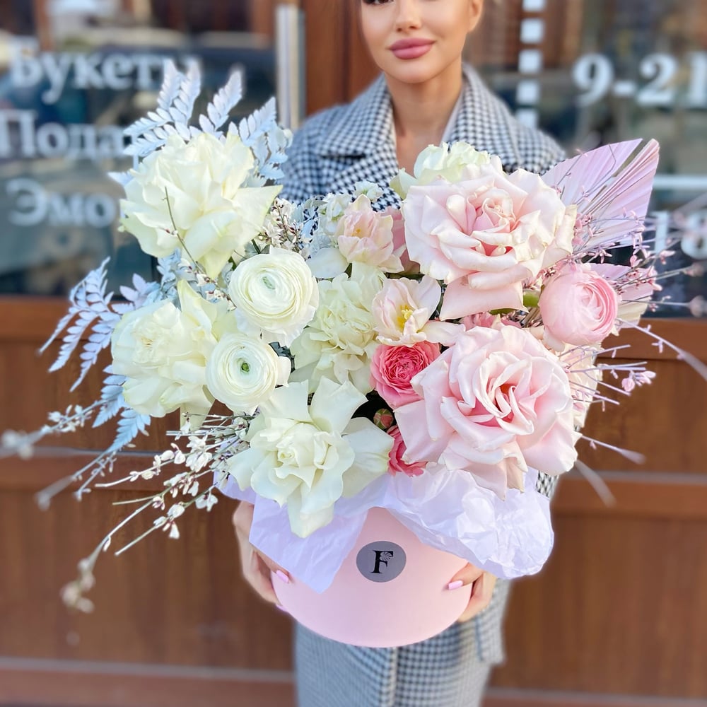 Шляпная коробка с цветами «Романтическая история» из экзотических цветов и роз