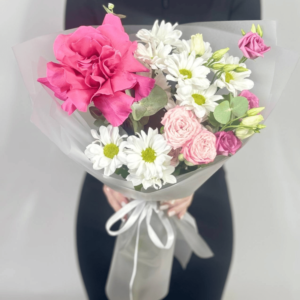 Этот изысканный букет, словно сошедший с полотна художника, очаровывает с первого взгляда. Нежные пастельные оттенки распускаются в гармоничном танце цветов, создавая неповторимую симфонию красок.