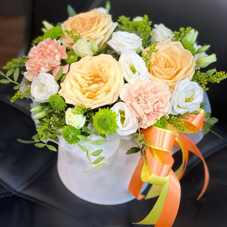 Шляпная коробка с цветами «Романтик» из роз и эустом