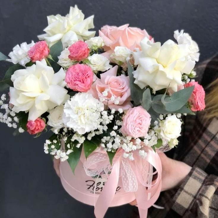 Шляпная коробка с цветами «Романтика» из роз и гвоздик