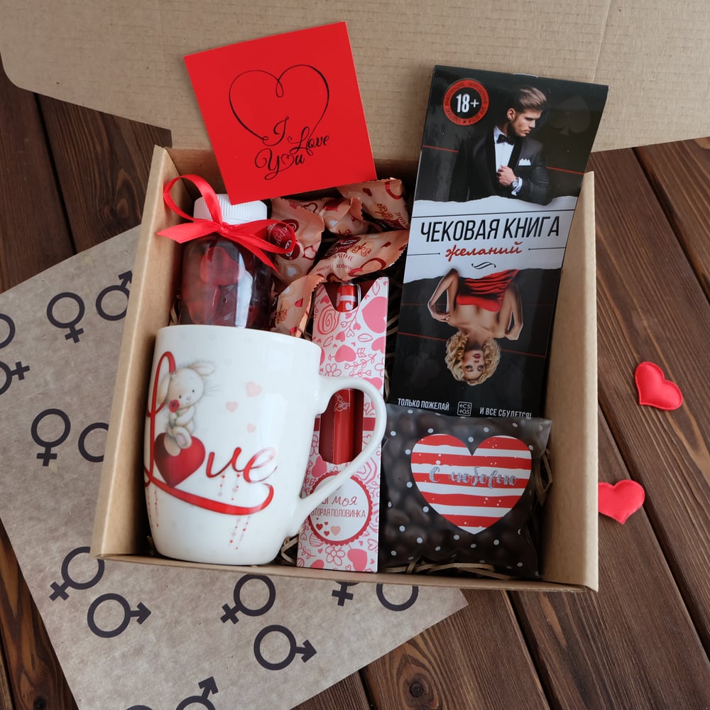 В наборе: 📌Коробка 20*20*9 см 📌Кружка 340 мл 📌Горячие купоны (Чековая книжка желаний) 📌Ручка подарочная "Ты моя вторая половинка" 📌Арахис в темном шоколаде 📌Мармелад в форме сердечек 📌Шоколадные конфеты Сердцеедка (в форме сердечка) 📌Открытка