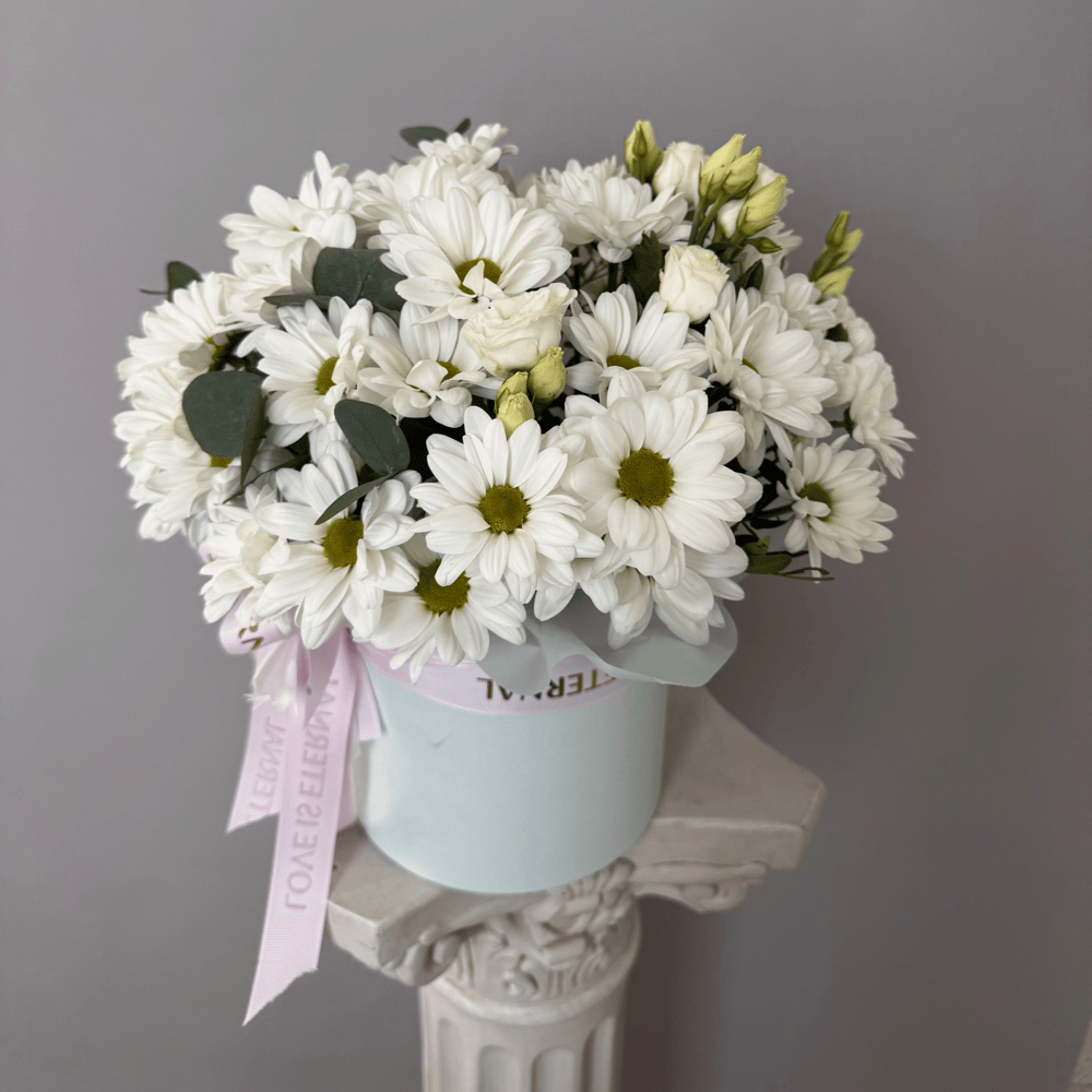 Шляпная коробка с цветами «Romashka» из хризантем и эустом