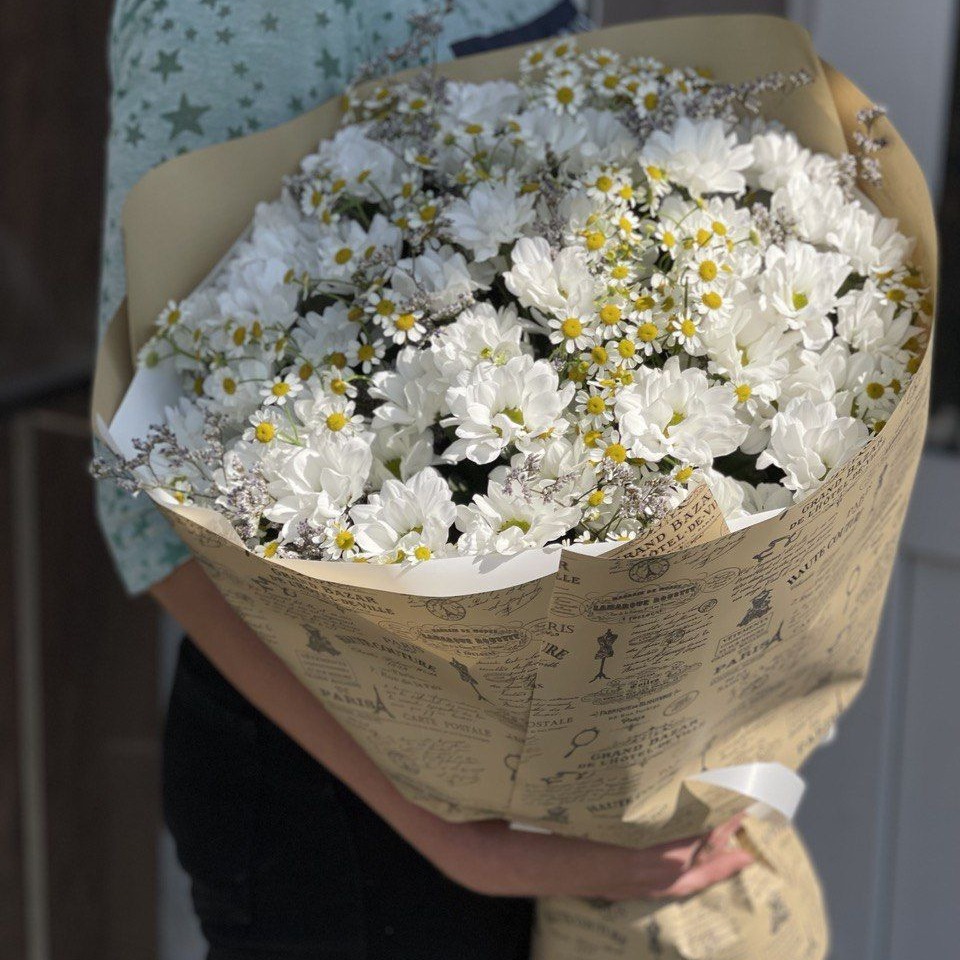 Букет из разных ромашек подарит шикарное настроение и порадует любого получателя.