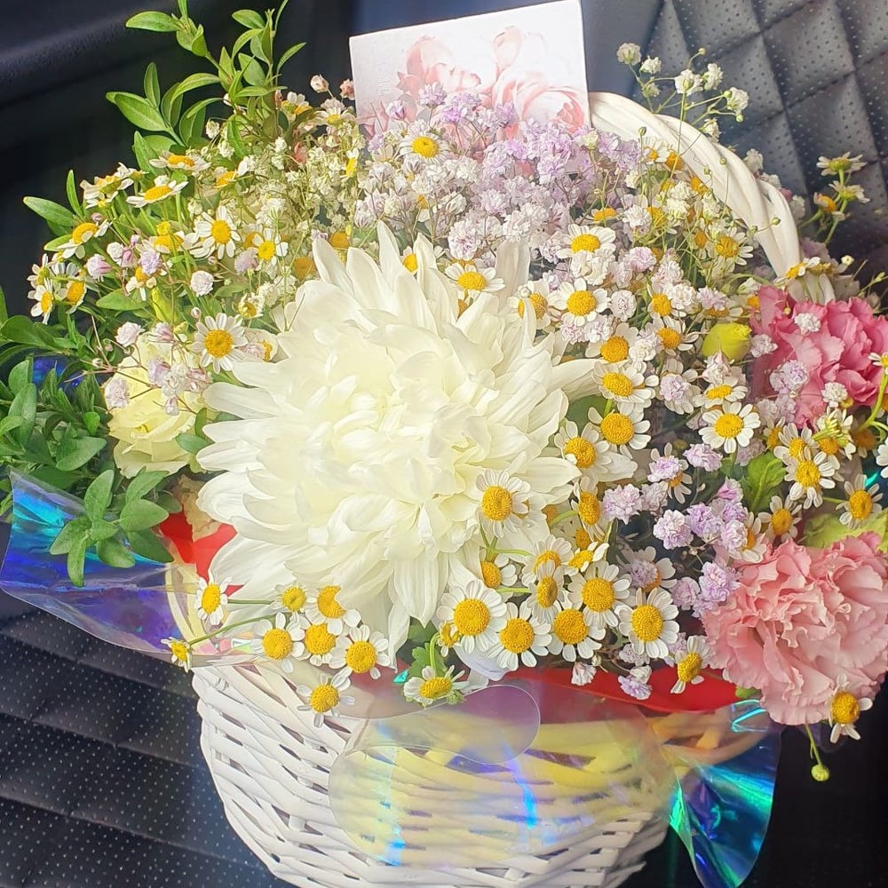 Яркий, воздушный, летний букет из ромашек, гипсофилы, хризантем и лизиантуса. Ромашки символизируют чистоту и невинность, а также приносят радость и уединение. Гипсофила добавляет воздушность и легкость в композицию, создавая романтическую атмосферу. Хризантемы являются символом долголетия, благополучия и удачи. А эустома выделяется своей изысканной красотой и олицетворяет прекрасные чувства и изящество. Все это разнообразие цветов упаковано в стильную и элегантную корзину, что делает букет еще более привлекательным и готовым к подарку.