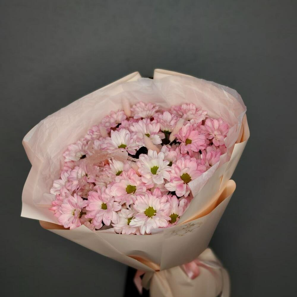Нежный букет из ромашковых хризантем в бело-розовой гамме. Цветы аккуратно упакованы в светлую бумагу, дополнены изящной лентой. Выглядит свежо и утончённо — идеальный вариант для тёплого подарка.