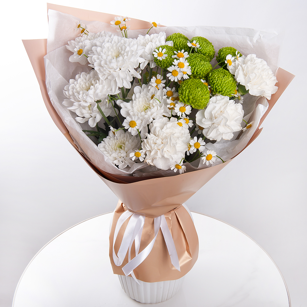 Букет «Ромашковые грезы» из гвоздик и хризантем