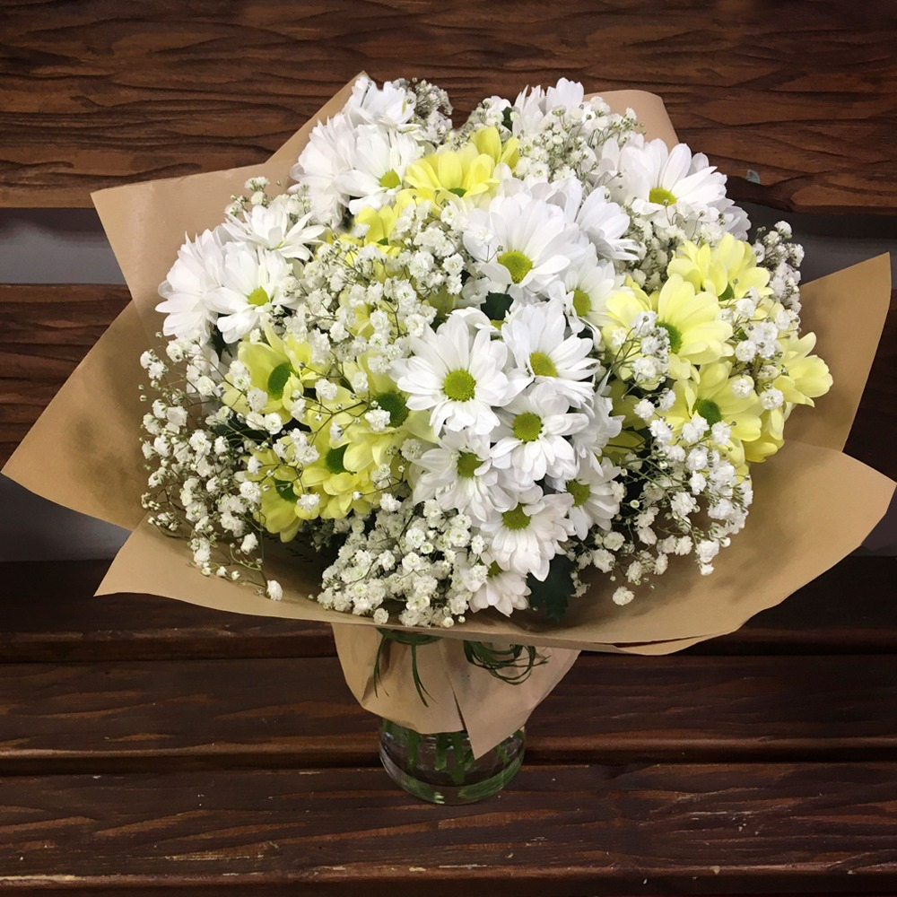 Букет «Ромашковый луг» из хризантем и гипсофил