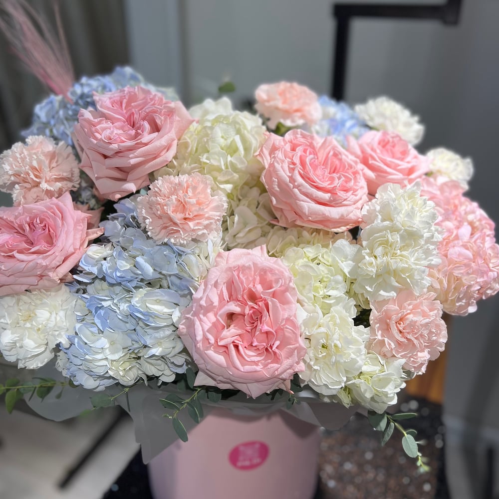 Этот нежный и изысканный букет сочетает в себе изысканные диантусы, великолепные гортензии (гидрангии), розы пионовидной формы. Дополняют композицию свежие зеленые веточки эвкалипта, которые придают букету легкость и неповторимый аромат. Букет оформлен в оазисе для долгого сохранения свежести цветов и уложен в стильную шляпную коробку, что делает его идеальным подарком для особых случаев.
