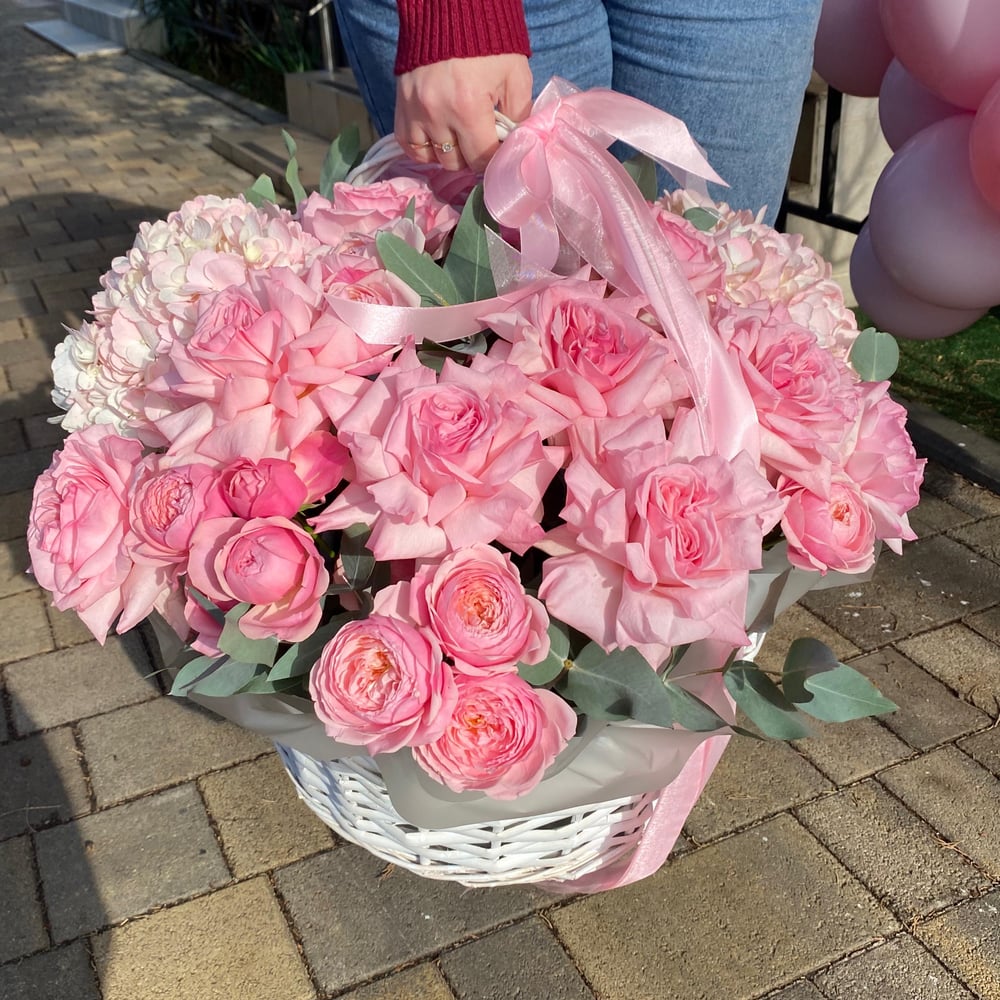 Роскошная корзина цветов из роз и гортензий