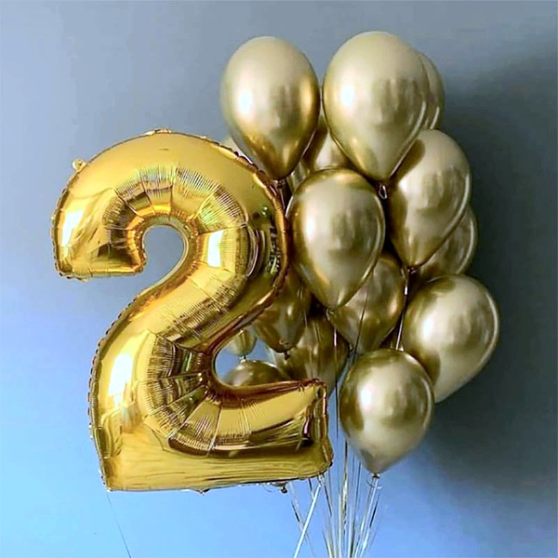 Композиция из фольгированной цифры (высота 102 см.) и 15-ти шаров хром в золотом цвете. Есть грузики. Шары обработаны специальным составом, чтобы дольше летали. По желанию можно сделать с другой ци...