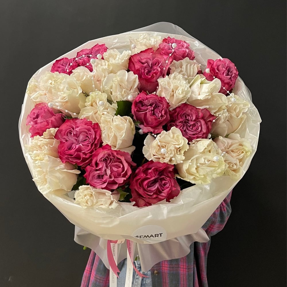 Шикарный букет из премиальных пионовидных эквадорских роз двух оттенков - глубокого розового "Кантри Блюз" и нежного кремового "Коттон Экспрешн". Цветы аккуратно собраны и украшены элегантной полуп...
