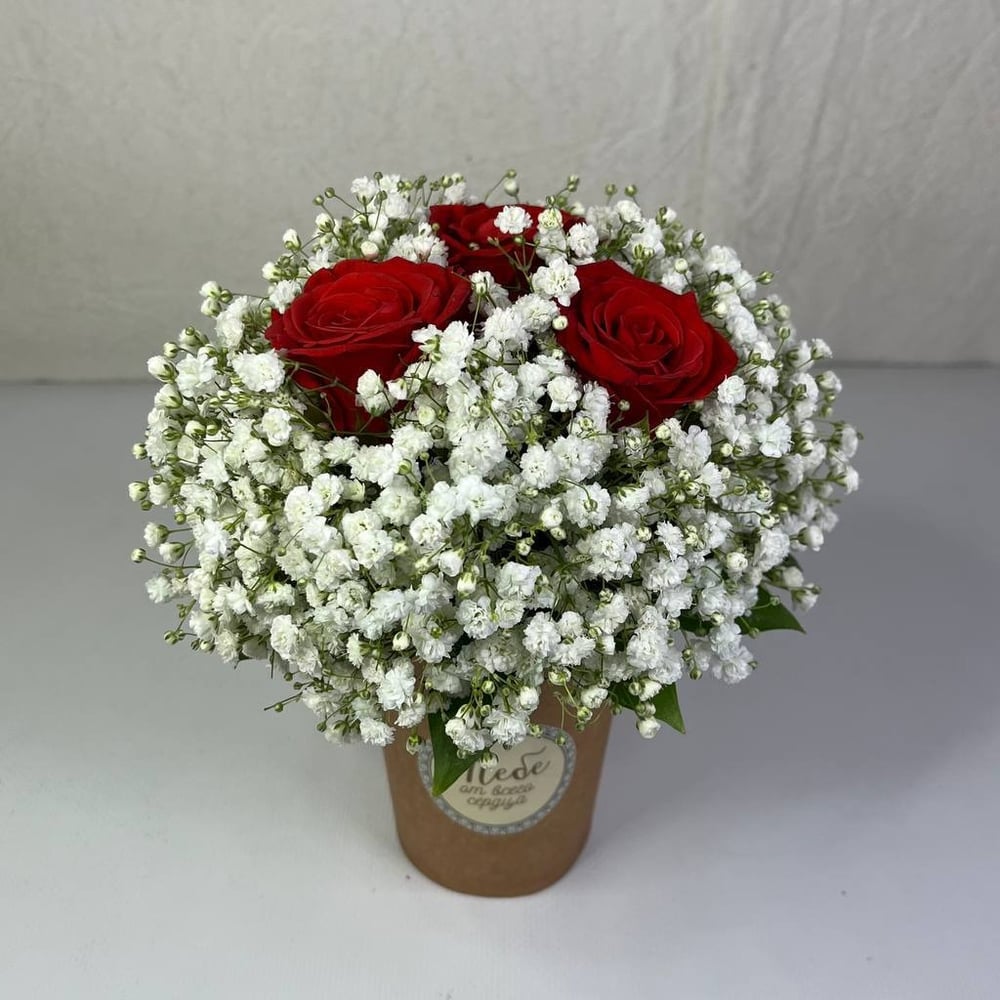 Коробка с цветами «Роза и гипсофила в стаканчике»