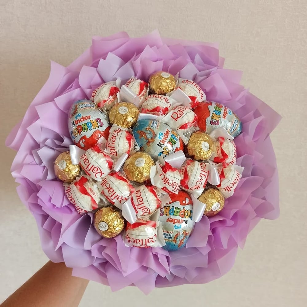 Очаровательный букет из конфет Рафаэлло, Ферреро Роше Киндер-Сюрпризов в нежной сиреневой гамме. Воздушный и лёгкий букет. Упаковка конфет не нарушена.