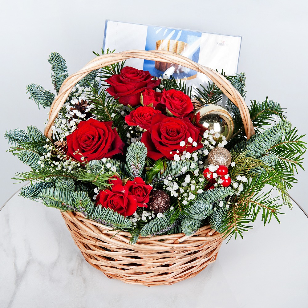 Идеальный подарок для любимых в новогодние праздники: роскошные розы и хвойные ветви в корзине, украшенные новогодним декором, подарят атмосферу тепла и праздника. В комплекте — вкусные конфеты Merci, которые сделают момент еще более особенным.