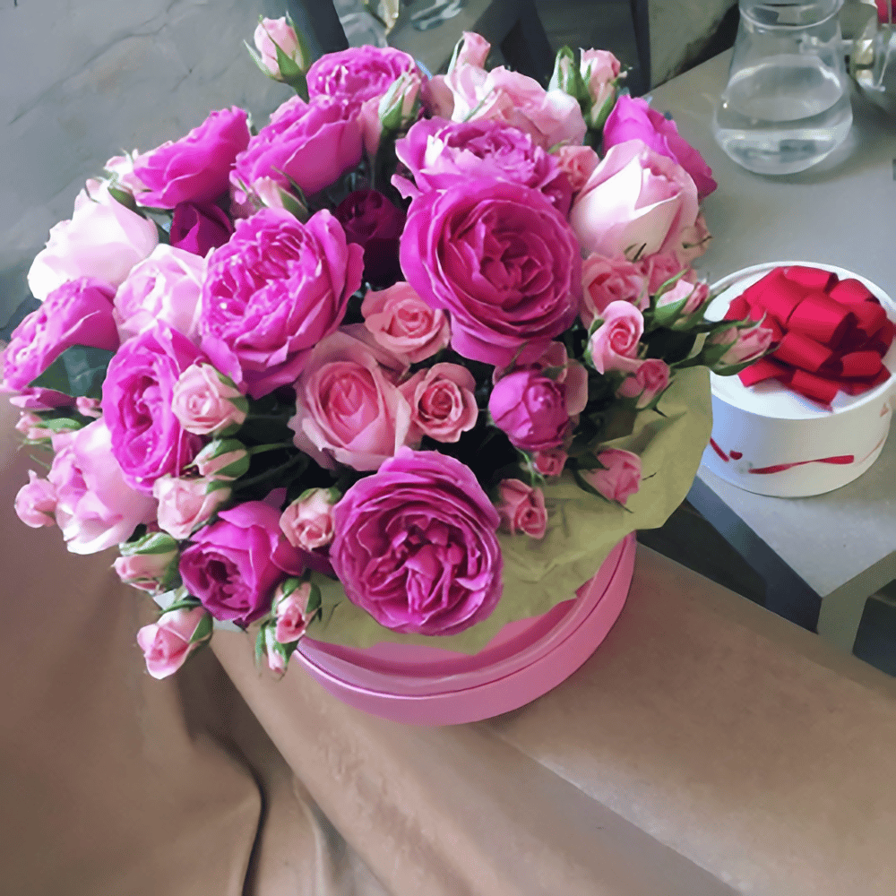 Очень красивая и нежная композиция собранная в коробке,что послужит большим плюсом для получателя т.к не нужно искать вазу для цветов.В составе пионовидная роза Мисти Баблз в сочетании нежной кустовой розы с добавлением декоративной зелени.