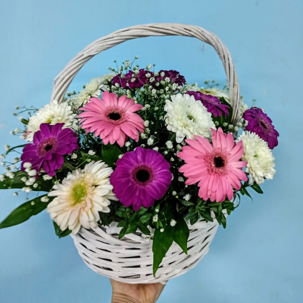 Объемная корзина с герберами в нежных розовых, белых и лиловых тонах. Отличный вариант подарка для любого случая.