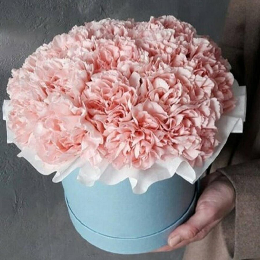 Шляпная коробка с цветами «Розовая акварель» из гвоздик