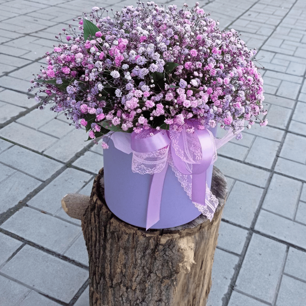 Шляпная коробка с цветами «Розовая гипсофила в коробке»