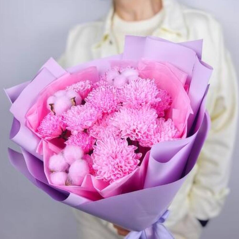 Этот букет — воплощение нежности и утончённости. В его композиции гармонично сочетаются розовые хризантемы, которые символизируют радость и тепло, и пушистые коробочки хлопка, добавляющие букету необычную текстуру и объём.