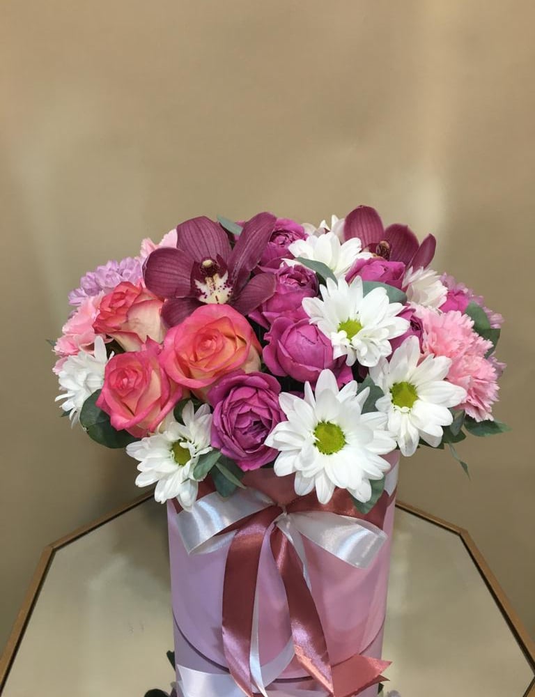 букет в коробке с орхидеей, пионовидной кустовой розой , хризантемой кустовой и одноголовой розой