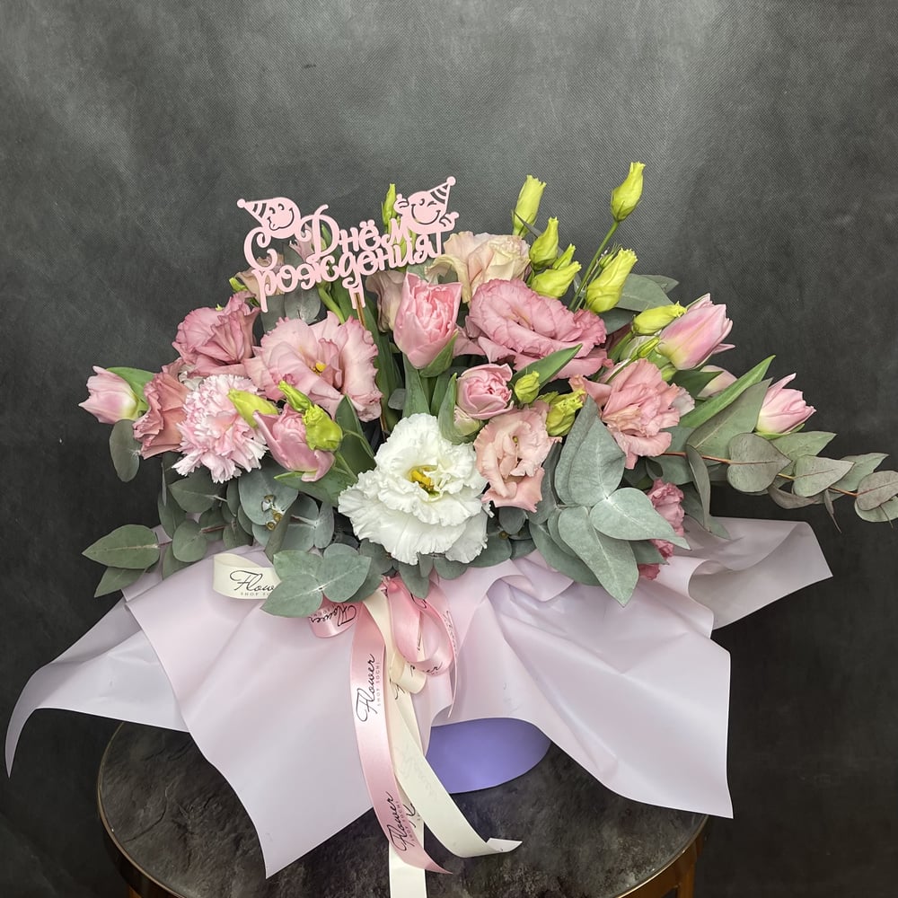 Шляпная коробка с цветами «Розовая прелесть» из тюльпанов и гвоздик