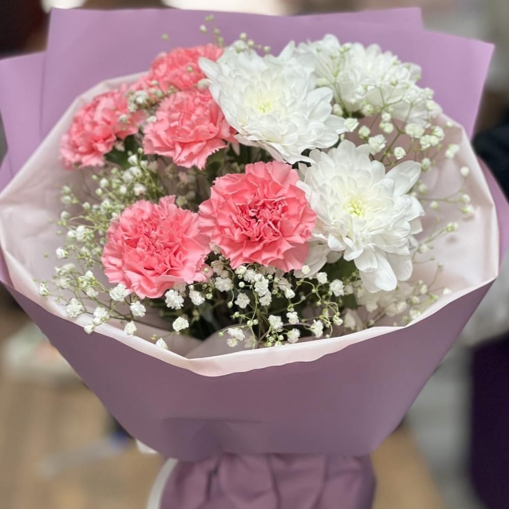 Букет «Розовая счастье» из гвоздик и гипсофил